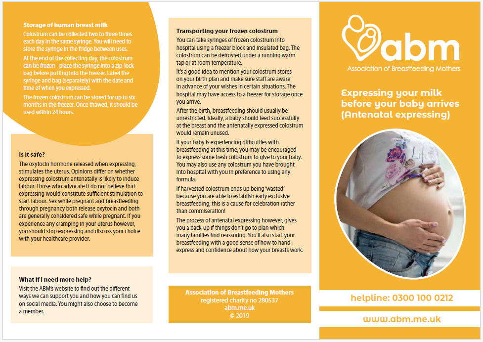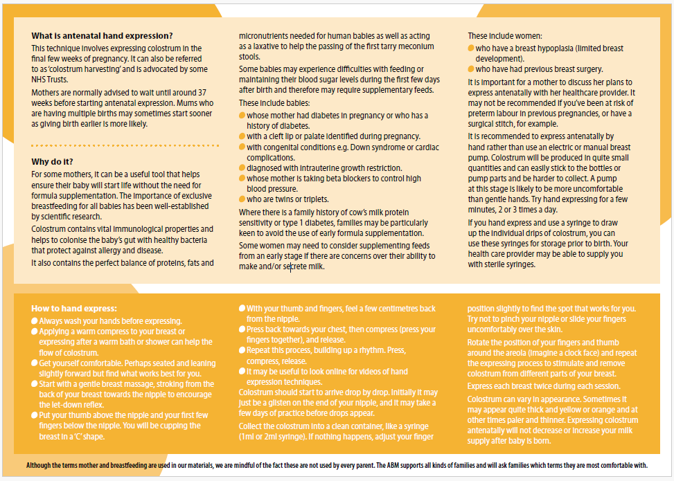 This involves expressing colostrum in the final few weeks of pregnancy. It can also be referred to as ‘colostrum harvesting’ and is advocated by some NHS Trusts.