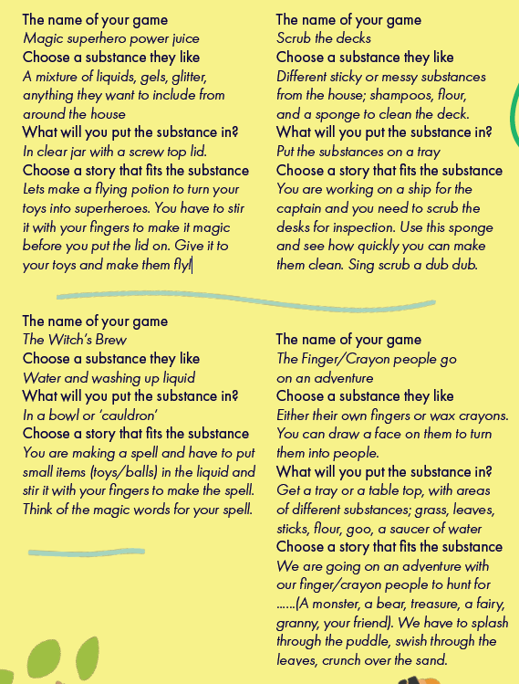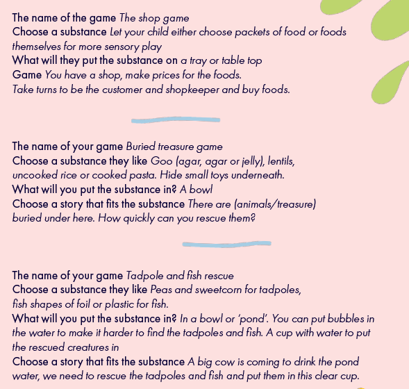 Sensory chaining: If your child is reluctant to touch very different substances, have a go at sensory chaining. You will need to start by identifying a substance they like touching, and then try to make changes to it. Start your games with these, but then try to chain these substances to less-familiar ones. Think of a slightly different substance that is unfamiliar but similar, or try mixing less-familiar substances in the familiar one.